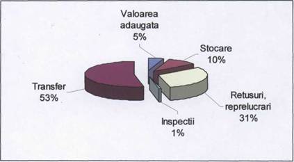Nici o firma cu specific productiv nu poate inregistra un procent de 100% activitati cu valoare adaugata. Firmele cele mai performante pe plan mondial ajung sa aiba circa 30 -50% activitati cu valoare adaugata. in mod obisnuit valorile inregistrate uzual, din punctul de vedere al activitatilor ce aduc valoare adaugata, de unitatile productive obisnuite sunt cuprinse intre 0,3% si 25% din totalul activitatilor inregistrate. in graficul urmator este prezentat raportul dintre activitatile cu valoare adaugata si cele fara valoare adaugata inregistrate in mod uzual. Desigur sunt operatii ce nu adauga valoare produsului final, dar care sunt strict necesare pentru ca fluxul de productie sa fie functional. Scopul principal este de a reduce, pe cat posibil, sau de a elimina ponderea activitatilor fara valoare adaugata si de a creste viteza in cadrul tuturor activitatilor pentru a permite unitatii de productie sa raspunda cat mai rapid schimbarii cereri si nevoilor de pe piata.