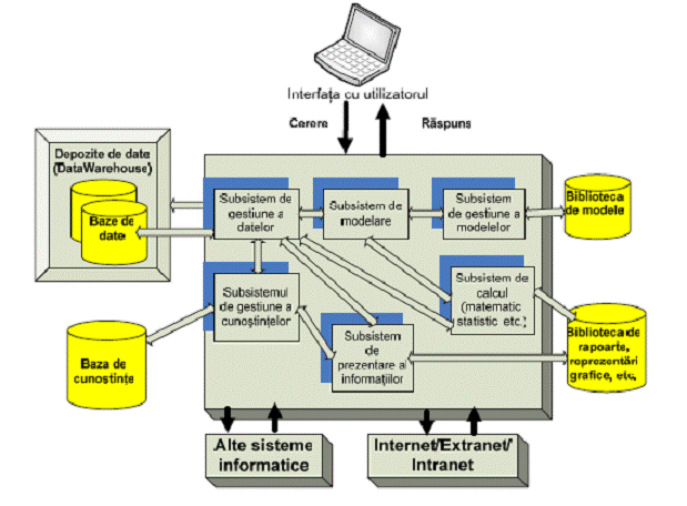 - Pentru fundamentarea unei decizii, poate face apel la baze de date, la alte fisiere existente in cadrul firmei, la sisteme expert, etc. De asemenea, se poate face apel si la informatii si date provenite din surse externe, preluate prin intermediul retelei Internet sau Intranet, Extranet;