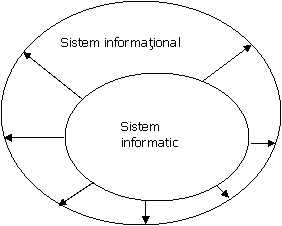 Acel subsistem al sistemului informational, care foloseste echipamente de prelucrare automata a datelor (hardware) si aplicatii pentru echipamentele in cauza (software de baza si software de aplicatii), necesare furnizarii de informatii sistemului informational, se numeste sistem informatic. In alti termeni: pentru a defini un sistem informatic in cadrul unui sistem informational, trebuie sa precizam in mod concret regulile, procedurile, mijloacele si metodele utilizate in cadrul acestuia; mai mult trebuie sa precizam legile care opereaza cu acesta in cadrul unui ansamblu corelat. Daca ar fi sa reprezentam sistemul informatic si sistemul informational ca multimi ele vor arata ca in figura 1; evident intr-un timp imprevizibil vor coincide.