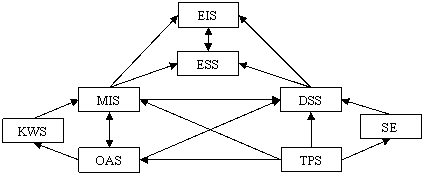 Intre sistemele informatice utilizate in cadrul unei organizatii se creeaza dependente si interdependente, acestea fiind reprezentate in Figura 2. Corespondenta intre tipurile de decizii si tipurile de sisteme informatice utilizate in cadrul unei organizatii se poate urmari in Tabelul 1.