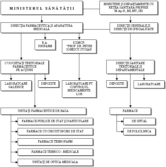 Dintre acestea, cel mai bine reprezentat la nivel national este Ministerul Apararii Nationale, cu o retea sanitara completa, care include spitale, farmacii de circuit inchis si de spital, depozite farmaceutice, sanatorii.