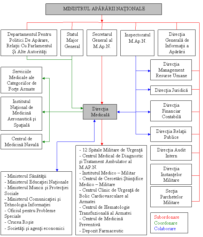 Organul de specialitate al Ministerului Apararii Nationale este Directia Medicala, unitate organizata si care functioneaza potrivit prevederilor OUG 14/2001 privind organizarea si functionarea M.Ap.N. si HG 217/2001 privind structura organizatorica si efectivele M.Ap.N..