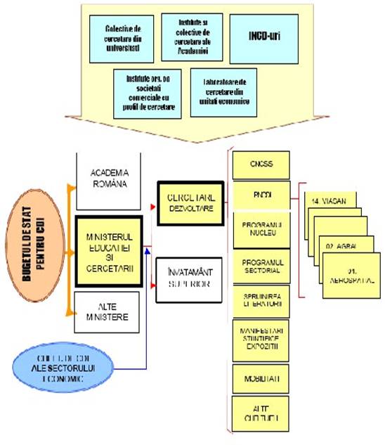 In conformitate cu prevederile Legii privind cercetarea stiintifica si dezvoltarea tehnologica institutele nationale de cercetare-dezvoltare ca forma de organizare institutionala specifica participa alaturi de celelalte institutii la desfasurarea activitatilor de cercetare-dezvoltare avand acces atat la resursele bugetare destinate acestui scop cat si la alte resurse puse la dispozitie direct de catre beneficiari (Figura 2).