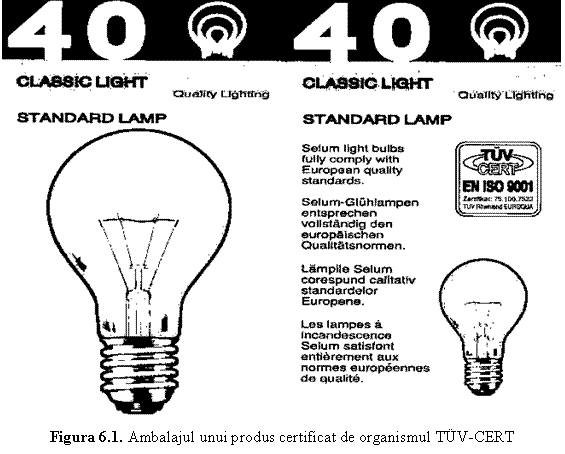 In 1997 era acreditat in Romania pentru certificarea sistemelor calitatii, ca organism extern, doar TV Bayern Sachsen, M nchen, Germania, cu o reprezentanta in Bucuresti (cu posibilitatea certificarii sistemelor calitatii si cu documentatia intocmita in limba romana!). Acest organism este acreditat sa certifice sistemele calitatii, practic, in toate domeniile de activitate economica. In figura 6.1. se prezinta imaginea ambalajului produselor unei firme romanesti certificate de organismul T V - Cert, in conformitate cu standardul ISO 9001.