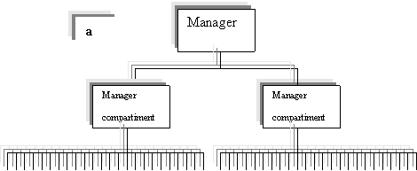 Dependenta dintre aria de cuprindere a managementului si marimea si numarul compartimentelor dintr-o organizatie se pune in evidenta prin exemplul prezentat in figura 4.14. Organizatia are 48 de posturi de executie si aplica pentru exemplificare doua solutii privitoare la aria de cuprindere. Prima solutie (fig.1.16a) presupune arii de cuprindere extinse, respectiv cate 24 de posturi intr-un compartiment atribuit unui manager si numai doua niveluri ierarhice. Cea de a doua solutie (fig.1.16b) presupune arii de cuprindere mai restranse, respectiv cate 8 posturi cuprinse intr-un compartiment atribuit unui manager si un nivel ierarhic in plus.