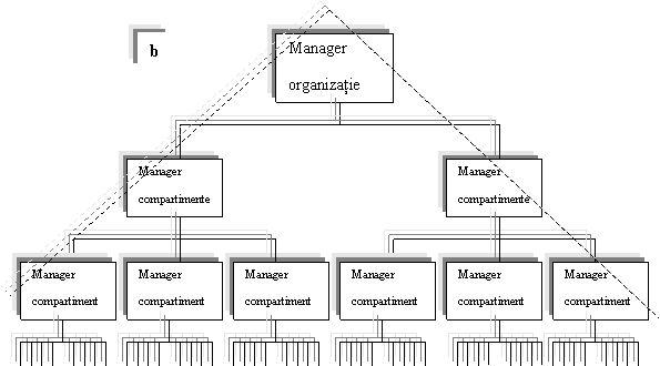 Aria de cuprindere extinsa conduce la o structura organizationala plata (fig.1.16a) in care numarul nivelurilor ierarhice este redus si ca urmare circuitele informationale verticale, de la varful ierarhiei pana la nivelul inferior al acesteia, se scurteaza.