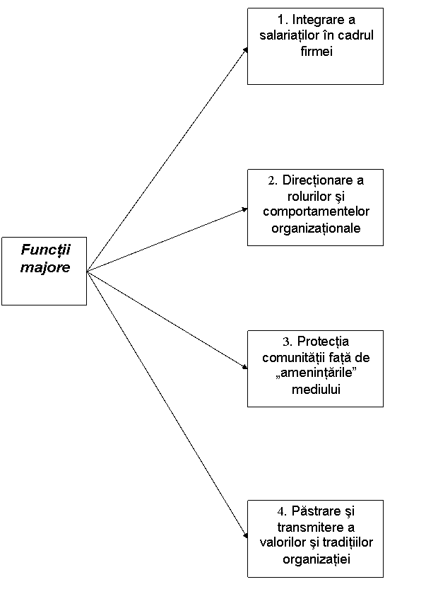 3. Protectia salariatilor firmei fata de amenintarile potentiale ale mediului ambiant. Intotdeauna contextul financiar, social, politic, stiintific, juridic etc. incorporeaza evolutii care pot afecta atat pozitiv cat si negativ comunitatea salariatilor din cadrul firmei. Cultura organizationala constituie suportul comportamentelor si actiunilor organizationale de natura preventiva sau de combatere directa a consecintelor negative din cadrul mediului firmei. Trecerea la economia de piata genereaza nu putine amenintari potentiale pentru comunitatile de salariati din societatile comerciale si regiile autonome, in depasirea carora culturile organizationale implicate au rol major.