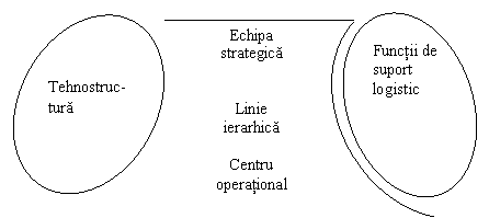 Pe axul vertical al constructiei se afla partea din aparatul de conducere care concepe strategiile organizatiei, corespunzator top managerului, si cea care asigura concretizarea si transmiterea comenzilor pana la centrul operational. Acestei parti a aparatului ii sunt atasate doua sectoare de staff care "normeaza" sau "standardizeaza" activitatile desfasurate pe axul vertical, de baza: in stanga figurii este asezata tehnostructura, respectiv staff-ul tehnic, iar in dreapta functiile de suport logistic, corespunzatoare staff-ului administrativ. Acestea sunt reprezentate prin doua elipse atasate la axul central, pe care il influenteaza direct.