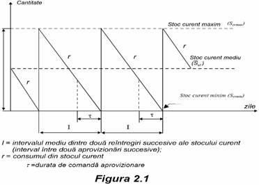 'Stocul curent' reprezinta cantitatea de materii prime si materiale noi si refolosibile, de combustibili si lubrifianti, de piese de schimb, subansamble etc. care se acumuleaza in depozitele si magaziile unei unitati economice in scopul acoperirii cererilor pentru consum in volumul, structura si ritmicitatea specifice, in intervalul dintre doua aprovizionari succesive. Este stocul care se formeaza in mod obisnuit in intreprinderi, pentru alimentarea consumului. Evolutia stocului curent se prezinta in figura 2.1 ; pe parcursul formarii si utilizarii, stocul curent inregistreaza mai multe nivele intre care semnificative sunt 'maxim' 'mediu' 'minim' Nivelul maxim se inregistreaza in momentul intrarii, receptiei si trecerii in gestiune a unui lot nou de materiale (produse, componente etc.) sosit de la furnizori; nivelul mediu estimat va fi nivelul maxim impartit la doi, iar