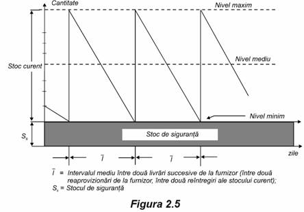 prealabile si cu acordul conducerii asigurarii materiale (care va stabili masuri eficiente de mentinere a ritmului prestabilit al aprovizionarilor). Evidenta scriptica acestui tip de stoc se tine distinct de celelalte categorii, in cadrul fiselor de magazie. Dinamica stocului de siguranta in raport cu cea a stocului curent, ca si corelatia dintre acestea se prezinta in figura 2.5. Este un stoc considerat intangibil, consumul din cadrul acestuia presupune reintregirea imediata, din loturile urmatoare primite de la furnizori, in scopul reluarii functiei specifice.