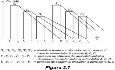Semnificativ este faptul ca asemenea 'stocuri' pot sau nu pot fi constituite ca o marime distincta fata de stocul curent ; formarea separata de acesta amplifica volumul stocurilor, implicit capitalul circulant si scade astfel eficienta in utilizarea fondurilor intreprinderii. Prin esalonarea rationala, cantitativa si in timp, a stocului curent pe punctele de consum se poate preveni situatia de mai sus. Acest aspect este posibil, dupa caz si conditii, si prin formarea stocurilor direct la depozitele subunitatilor dispersate territorial (evitand depozitul central sau folosindu-l numai pentru alimentarea punctelor de consum apropiate unde nu este economica amenajarea unor magazii prea mari etc.). Dinamica formarii si utilizarii stocului pentru transport intern la trei subunitati de consum se prezinta in figura 2.7.