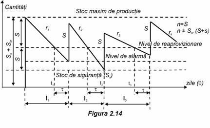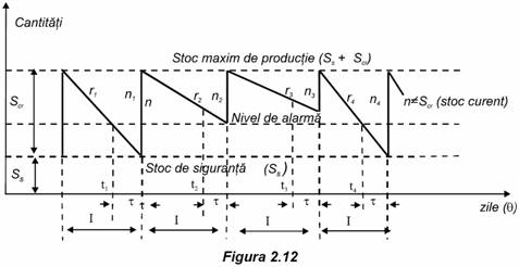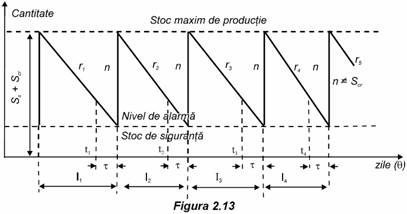 3. Gestiunea cu cerere variabila la intervale neegale, la care nu se cunosc momentele calendaristice (ti) de lansare a comenzilor, ele trebuind determinate prin extrapolare; ca si in cazul tipului de gestiune anterior, problema estimarii este dificila, fiind in functie de modul in care se manifesta cererea in cadrul duratei de aprovizionare (dar pentru care se poate cunoaste distributia statistica). Reaprovizionarile se fac in loturi constante ca nivel, stabilite la inceputul perioadei de gestiune. Prevede formarea si a stocului de siguranta al carui nivel de formare il va reprezenta si pe cel de alarma. Acest tip de gestiune (dinamica in figura 2.13) este caracteristic intreprinderilor cu un volum mare de productie nenominalizata sau prestatoare de servicii, de reparatii care produc bunuri de larg consum la cerere etc.