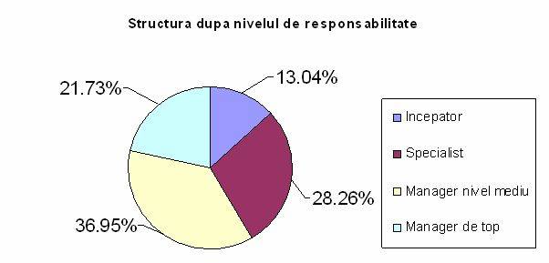 Majoritatea celor care au raspuns intrebarilor studiului nostru sunt specialisti si manageri de nivel mediu si de top. Acest lucru certifica faptul ca raspunsurile primite sunt bine informate si dublate de o experienta semnificativa in domeniu. Un alt aspect constatat este faptul ca aproximativ 50% dintre cei care au contribuit la realizarea studiului lucreaza chiar in cadrul departamentelor responsabile de crearea si implementarea structurii de comunicare a organizatiei, iar procentul celor care lucreaza in departamentele HR si PR este de peste 30%.