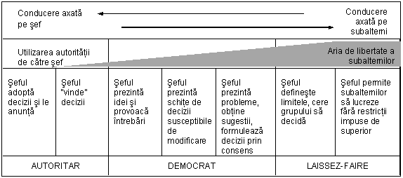 Modul de adoptare a deciziilor, implicarea in acest proces si ponderea responsabilitatii liderului si grupului in cele trei stiluri si in variantele intermediare, sunt prezentate in figura de mai sus. Scala prezinta o descrestere progresiva a utilizarii autoritatii de catre sef, de la stilul autoritar radical spre stilul laissez-faire absolut. Ponderea implicarii grupului in luarea deciziei creste proportional cu aria de libertate a subalternilor si cu responsabilitatea pe care si-o asuma.