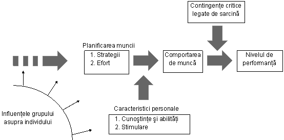 Eficienta individuala sau performanta in munca este determinata de comportamentul de munca si este influentata de contingentele critice legate de sarcina (daca locul de munca este aprovizionat cu materiile prime necesare, daca apar defectiuni ale utilajelor, intreruperi incidentale ale procesului tehnologic etc.). La randul sau, comportamentul propriu-zis de munca este determinat de strategiile folosite (metode si mijloace), de efortul depus de individ si este influentat de caracteristicile personale (cunostinte, abilitati, stimulare, motivatie). Grupul actioneaza asupra individului la nivelul tuturor determinantilor susmentionati ai comportamentului, influentand astfel performanta in munca.