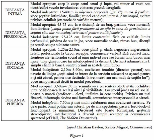 Proxemica este cea care studiaza toate aceste relatii spatiale ca mod de comunicare. Jocul teritoriilor, modul de a percepe spatiul in diferite culturi, efectele simbolice ale organizarii spatiale, distantele fizice ale comunicarii tin de aceasta disciplina. De aceasta disciplina este legat si numele lui Edward Hall, (Limbajul tacut, Dimensiunea ascunsa, Dincolo de cultura). El tinde sa dea o definitie a culturii ca ansamblu de coduri si va aplica aceasta codificare in cea mai celebra lucrarea a sa, The Hidden Dimension - Dimensiunea ascunsa, adevarata gramatica a spatiului. El pleaca de la idea ca animalele au un teritoriu adaptat nevoilor lor si ca omul poseda si el aceasta notiune de spatiu individual, de bula psihologica. Orice spatiu personal se organizeaza cu o parte interioara si cu una exterioara; el poseda zone private, zone publice. Astfel, lumea nord occidentala comunica in functie de patru distante: intima, personala, sociala, publica (figura 1).