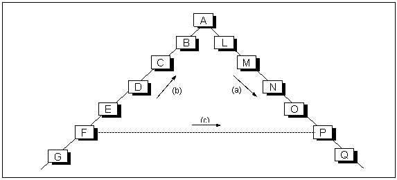 In cazul retelelor formale sensul de circulatie poate fi (a) descendent (de la compartimentele /persoanele de decizie spre cei care executa deciziile), (b) ascendent (de la instantele de executie spre cele de decizie) si (c) orizontal (intre persoane aflate la acelasi nivel ierarhic). In figura de mai jos, comunicarea este realizata pe canale impuse de structurarea ierarhica a activitatii. Daca F vrea sa comunice cu P, trebuie sa urmeze canalele ascendente E - D - C - B - A si apoi descendente L - M - N - O. In acest lant de emitatori /receptori, mesajul sau ar putea fi supus unor distorsiuni repetate, situatie care ar putea fi evitata daca ei ar putea stabili o comunicare orizontala, mai directa.
