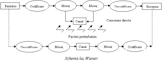 C)Schema lui Wiener, ce completeaza precedentele realizari cu feed-back-ul (informatia retur) in posesia caruia emitatorul intra, cunoscand astfel maniera de receptare a mesajului comunicatiei; schema lui Wiener, imbogatita si prin alte elemente ce tin de complexitatea deosebita a proceselor de comunicare, are urmatoarea infatisare: