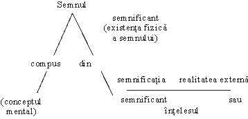 Deci, pentru Saussure, un semn este alcatuit dintr-un semnificant si semnificat, "semnificantul este imaginea semnului asa cum o percepem noi -semnul de pe hartie sau sunetul; semnificatul este conceptul mental la care se refera acesta; concept care este mai mult sau mai putin comun tuturor membrilor aceleiasi culturi, care impartasesc aceeasi limba". Cuvantul "caine" denoteaza (=conventie lingvistica) specia canina si pe fiecare dintre membrii sai (extensie) si conoteaza proprietatile caracteristice acestei specii (comprehensiune), formulare preluata de la logicianul Frege Gottlob.