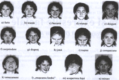 Toate acestea ilustreaza sapte tipuri de emotii: furia, dezgustul, teama, bucuria, supararea, satisfactia si surprinderea, recunoscute ca fiind universale. Pe langa acestia, Jonathan Haidt si Deacher Keltner 1999, mai supun atentiei si alte stari: jena, rusinea, compasiunea, amuzamentul, muscarea limbii, acoperirea fetei sau mirarea.[25]