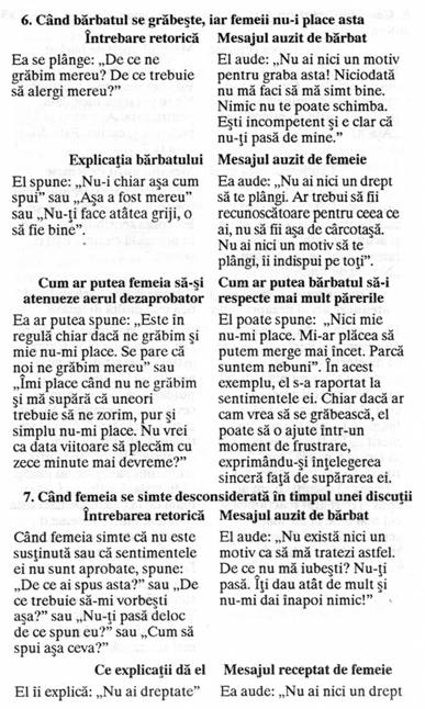 Cand barbatul aude o intrebare cum ar fi "Cum poti sa intarzii atat?' sau "De ce n-ai sunat?', el nu-i aude sentimentele, ci