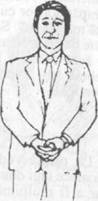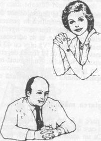 Se pare ca exista o anumita corelatie si intre nivelul 'a care mana este ridicata si gradul de dispozitie negata a individului: te intelegi mai greu cu unul care tine mainile inclestate intr-o pozitie ridicata, ca in Figura 39, decat cu cel care procedeaza ca in Figura 40. Si aici, ca in cazul tuturor gesturilor negative, trebuie facut ceva pentru ca degetele celui in cauza sa se desfaca, iar palmele si partea din fata a corpului sa devina vizibile, altfel atitudinea sa ostila se va mentine.