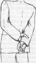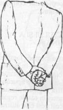 Este interesant de observat ca o data cu cresterea supararii omului, mana sa dusa la spate ajunge tot mai sus. Individul din Figura 46, de exemplu, face un efort mai mare de stapanire de sine, decat cel din Figura 45, intrucat una din mainile sale strange nu incheietura celeilalte maini, ci bratul superior. Din gesturi de acest tip se subinteleg expresii ca 'Tine-te bine, baiete!'. Agentii comerciali recurg adesea la acest gest atunci cand, chemati la un potential cumparator, sunt pusi sa astepte in anticamera. Este o incercare palida din partea lor de a-si ascunde nervozitatea si un cumparator istet isi va da scama probabil de situatie. Daca un gest de stapanire de sine se transforma intr-unul de apucare a mainii cu palma, rezultatul va fi un sentiment de calm si siguranta.