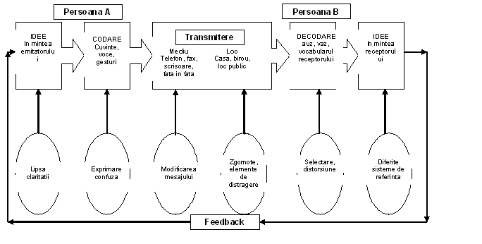 2) definitia comunicarii din perspectiva informationala a modelului standard: proces prin care un om influenteaza comportamentul altuia, incluzand toate procesele transmiterii de informatii intre toate vietuitoarele (oameni/animale, plante) prin semne de tot felul si/sau dispozitive tehnice, biologice, psihologice, sociale si alte sisteme de transmitere a informatiei (comunicarea = schimb de informatii intre indivizi realizat numai prin utilizarea unui sistem comun de simboluri, semne sau comportamente si numai daca destinatarul are prilejul de a-si exprima punctul de vedere fata de informatia emitentului pe care si-o asuma sau potrivit careia isi schimba comportamentul);