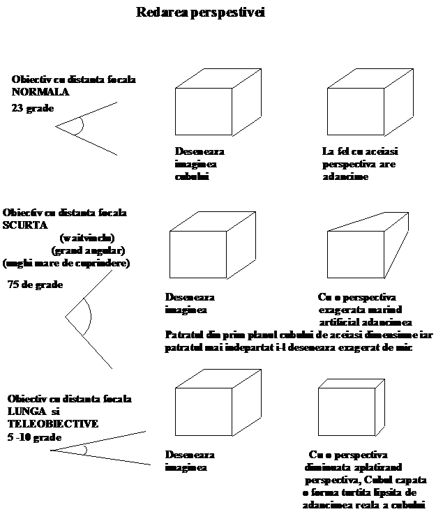 Trecand prin caracteristicile fiecarei categorii de obiective in parte d.pd.v. al tratarii perspestivei.Asta inseamna ca de la plan general se ajunge la plan intreg si in continuare pana la prim plan.