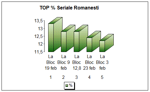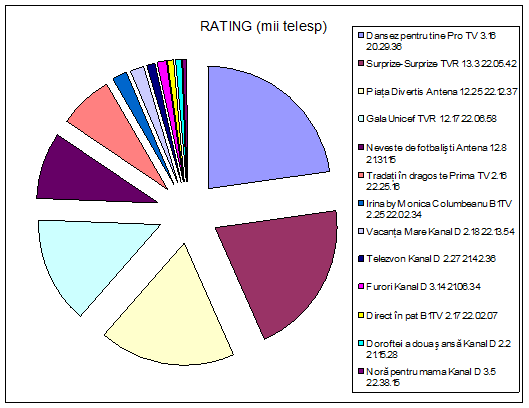 In topul primelor 10 emisiuni ca audienta se mai regasesc Antena 1 cu "Piata Divertis" (editia din 25 februarie a inregistrat peste 900.000 de telespectatori), Gala Unicef de pe TVR1 din 17 februarie, doua emisiuni de la Antena 1 - "Animal Planet Show" si "Neveste de fotbalisti" si o emisiune "Tradati in dragoste de la Prima TV. Diferenta dintre locul intai si locul 10 este de aproape 9 puncte de rating, care se traduc in termeni cantitativi intr-o diferenta de peste 800.000 de telespectatori.