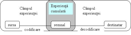 2. Introduce notiunea de camp de experienta al sursei (comunicatorului) si al receptorului, defint prin cunostintele, simbolurile, informatiile si atitudinile celor doua verigi, care armonizeaza receptorul si emitatorul, codificarea si decodificarea, functionarea codurilor comunicatorului si receptorului. Experienta cumulata (sectorul care rezulta din intretaierea celor doua campuri) faciliteaza, face dificila sau face imposibila comunicarea.