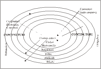 Intr-o prima etapa, comunicatorii (redactia unui ziar sau a unei televiziuni) produc mesaje ce trec mai intai prin diferite stadii de comunicare (coduri), sub forma informatiilor scrise sau audiovizuale. Anterior difuzarii, acestea sunt filtrate de controlor, adica de profesionistii ce decid asupra procesului de selectie. In fine, mesajele sunt emise prin media (ziar, televiziune). Intr-o a doua etapa intervin "regulatorii", ce pot fi grupuri de presiune, institutii (asociatii) ce pot exercita o anumita influenta asupra media, prin urmare pot afecta continutul si eficienta mesajului. Urmeaza filtrele informationale de ordin fizic (oboseala receptorului, de pilda) sau psihologic (centrul de interes al receptorului). In fine, mesajele ating audienta si provoaca anumite efecte.