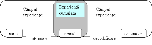 2. Introduce notiunea de camp de experienta al sursei (comunicatorului) si al receptorului, defint prin cunostintele, simbolurile, informatiile si atitudinile celor doua verigi, care armonizeaza receptorul si emitatorul, codificarea si decodificarea, functionarea codurilor comunicatorului si receptorului. Experienta cumulata (sectorul care rezulta din intretaierea celor doua campuri) faciliteaza, face dificila sau face imposibila comunicarea.