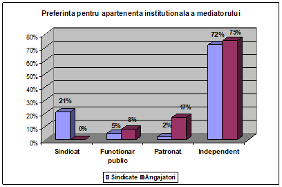 Posibilitatea de a alege mediatorul: peste 90% din sindicate si peste 80% din patronate au optat pentru posibilitatea de a alege mediatorul.