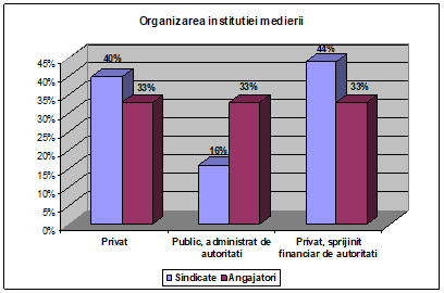 Organizarea medierii, ca serviciu de rezolvare a conflictelor de munca a adus perspective mult mai variate. În timp ce sindicatele prefera o organizare în sistem privat, cu sau fara sprijinul autoritatilor, patronatele nu indica o preferinta clara pentru vreuna din alternative (fig.nr. 4):