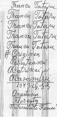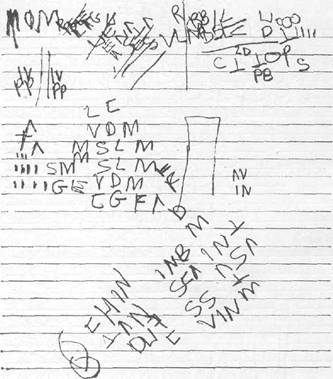 Fip. 12 - Descompunerea expresiei grafice Ia un schizofren, cu disparitia cuvin telor, plasarea bizara a grupurilor de litere si semne la marginile hirtiei, aglutinate, scris "in ghirlanda'.