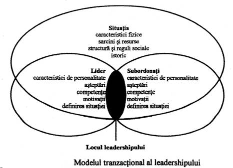 Zona in care se intalnesc cele trei variabile formeaza "locul" leadershipului - proces care rezulta din ceea ce flecare parte introduce si obtine. Modelul este viabil atata timp cat liderul si subalternul considera schimbul drept satisfacator sau echitabil de ambele parti; practic, subalternii sunt recompensati doar daca nivelul de performante negociat va fi realizat. Recunoasterea si recompensarea doar a acelor persoane care il urmeaza pe lider ramane prescriptie de tip traditionalist, rutinier, nefiind un motivator suficient de puternic in mobilizarea si antrenarea tuturor subalternilor pentru realizarea performantelor inalte. Conform acestui model, studiul leadershipului trebuie sa examineze toate interactiunile dintre cele trei variabile: lider, subalterni si situatie.