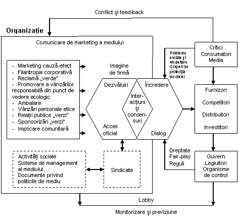 In functie de aceste elemente, Biroul francez de verificare a publicitatii propune un cod al reclamei ecologice respectiv un model al procesului de comunicare sustenabila (fig.3.5), care asigura transparenta deplina a organizatiei in cauza, concomitent cu sporirea increderii publicului in investitorii implicati in protejarea mediului fizic, ecologic. Un asemenea cod are obiective (masuri de protectie a mediului inconjurator, prezentarea principalelor caracteristici ecologice ale produsului realizat de organizatia sau firma respectiva) si reguli specifice: evitarea influentarii directe si indirecte a beneficiarilor, atestarea de catre institutii specializate a calitatilor ecologice ce se atribuie produsului s.a.