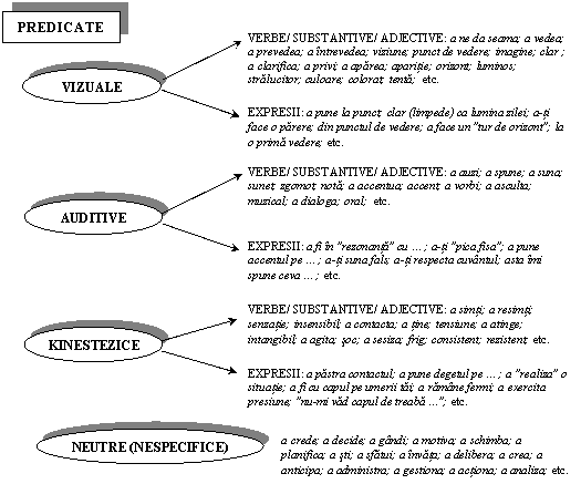 In mod evident, intrebarea care se impune, logic, este: cum recunoastem si/sau cum identificam canalul senzorial privilegiat de comunicare apelat de interlocutor ? Raspunsul consta in relevarea "predicatelor" (a verbelor si/sau a expresiilor) preferential apelate si utilizate de fiecare persoana, in functie de propriul canal senzorial privilegiat de comunicare (fig..nr.26).