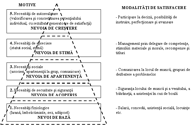 Din acest punct de vedere, teoria lui Maslow ("piramida trebuintelor") este semnificativa. Bazata pe etaje suprapuse de motive crescande ca importanta, "piramida" lui Maslow are cinci niveluri distincte. Acestea sunt: trebuintele organice; trebuintele de securitate; trebuintele de apartenenta la un grup; trebuintele de stima si statut social; trebuintele de autorealizare. Primele patru categorii sunt numite de Maslow trebuinte de deficit si corespund motivatiei de tip homeostazic, ultima categorie este denumita trebuinte de crestere si corespunde dezvoltarii personale a individului.