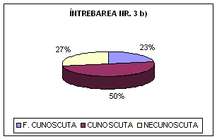 In cea de-a doua parte a intrebarii am dorit sa apelam la obiectivitatea persoanelor chestionate in ceea ce priveste popularitatea afirmatiei propuse atat la cei in cauza cat si in general. Varianta de raspuns "cunoscuta" a fost marcata de 195 dintre persoanele chestionate (50%) iar cea "foarte cunoscuta" de 87 de persoane (23%). Ceea ce putem deduce din aceste raspunsuri este ca foarte multi cunosc aceasta afirmatie si cad de acord asupra faptului ca ea este si adevarata. Totusi trebuie sa luam in calcul si raspunsurile oferite de cei 102 persoane (27%) care au raspuns negativ considerand ca afirmatia facuta nu este cunoscuta.