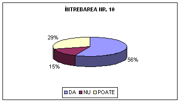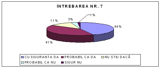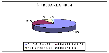 Insemnatatea acestei intrebari este covarsitoare intrucat noi suntem responsabili atat pentru protejarea naturii in momentul de fata dar suntem intr-o oarecare masura raspunzatori si pentru viitorul nostru prin prisma educatiei pe care o asiguram copiilor nostri. In cazul acestei intrebari am obtinut raspunsuri deosebit de favorabile intrucat 70% din cei chestionati au declarat ca isi educa sau isi vor educa copii in spiritul protejarii mediului considerandu-l foarte important. Ca un semn pozitiv poate fi interpretat si raspunsul celor 86 de persoane (21%) care au ales varianta "probabil ca da", procentul celor care isi vor educa copii in acest spirit si pe a caror sprijin "putem conta" crescand la 91%. Doar 9% (34) din persoanele chestionate au raspuns negativ, dar speram ca prin programe publicitare putem sa-i facem sa se razgandeasca.