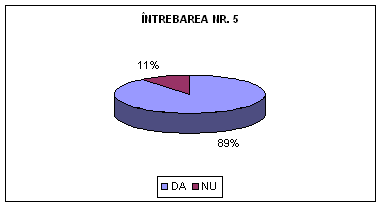 Intrebarea cu numarul 5 readuce in discutie termenul de reciclare si mai exact notorietatea a doua efecte ale acesteia si anume scaderea poluarii mediului si generarea de produse ecologice. Printr-o simpla si rapida analiza a tabelului si graficului putem observa ca 89% adica 342 de persoane din cele 384 chestionate sunt bine informate fiind constiente de cele doua efecte majore ale reciclarii. In urma comparatiei intre intrebarea 5 si intrebarea 1 se observa cu usurinta ca aproximativ acele persoane care cunosc intr-o oarecare masura insemnatatea acestui termen (335) au raspuns afirmativ si la aceasta intrebare.