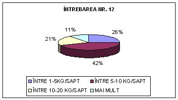 42% (165 de persoane) din persoanele produc intre 5-10 kg de deseuri pe saptamana, 26% produc intre 1-5 kg/sapt., 21% produc intre 10-20 kg/sapt. si numai 11% au ales produc mai mult de 20 kg/sapt.
