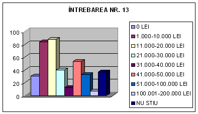 Intrebarea cu numarul 13 a fost formulata cu scopul de a oferi o imagine asupra disponibilitatii persoanelor chestionate de a plati o suma mai mare pentru acest serviciu decat in prezent. O concluzie generala privind raspunsurile persoanelor chestionate este aceea ca: numai un procent de 8% din persoanele chestionate nu sunt de acord cu plata unei sume in plus fata de momentul actual, 10% sunt nehotarati asupra sumei pe care ar dori sa o aloce iar restul de 82% au optat pentru contributii cu sume cuprinse intre 1.000 lei si chiar 200.000 lei /luna/familie. Rezultatele sunt incurajatoare pentru momentul in care, pentru colectarea deseurilor menajere sortate s-ar introduce o taxa mai mare decat cea existenta in momentul de fata.