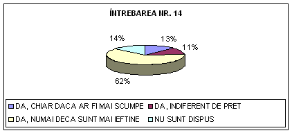 O mare problema a societatilor care au ca obiect de activitate reciclarea deseurilor menajere si mai apoi comercializarea produselor rezultate este reticenta si lipsa de informare a populatiei in cumpararea acestor produse. La succesul unui asemenea program intr-o foarte mare masura contribuie si sprijinul factorului uman. Cu ajutorul intrebarii 14 am dorit sa analizam intentia persoanelor chestionate de a cumpara aceste produse si in acelasi timp sensibilitatea lor fata de pretul acestora.