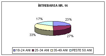 Pentru o mai buna clasificare a persoanelor chestionate am formulat intrebarea numarul 16 care face referire la varsta acestora. 23% din cei chestionati au varste cuprinse intre 18-24 de ani, 27% varste cuprinse intre 25-34, 33% varste cuprinse intre 35-49 de ani iar 17% sunt persoane cu varste peste 50 de ani. S-a ales varsta minima de 18 ani intrucat aceasta este varsta la care o persoana este considerata majora. Categoriile au fost alese in functie de tendinta care se observa in intemeierea unei familii, schimbul locurilor de munca precum si ideologiile si educatia care caracterizeaza fiecare grupa de varsta.