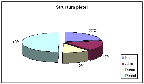 Dupa cum se poate remarca, volumul total al pietei este de aproximativ 250 milioane Euro, iar pozitia de lider este detinuta de Flanco ce are un avans de 5% fata de Altex, al doilea "actor" major de pe piata. Domo, cel de-al treilea nume de pe piata produselor electronice si electrocasnice incheie lista companiilor cu o cota de piata de cel putin 10%. Desi cota de piata detinuta de alte companii este semnificativa (49%) totusi putem remarca ca peste 50% din piata este detinuta de Flanco, Altex si Domo, in conditiile in care cotele restului companiilor nu depasesc 5%-6%.