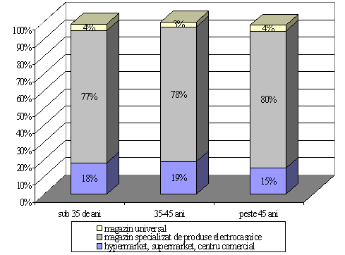 In cazul in care ar trebui sa desemneze o categorie preferata de magazine din care ar cumpara un produs electrocasnic, preferintele consumatorilor se indreapta catre magazinele specializate, variatia procentului in functie de varsta fiind nesemnificativa.