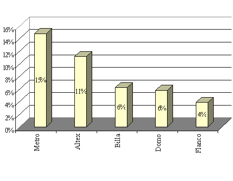 Diferenta de 49% din piata este reprezentata de detailisti de dimensiuni mai reduse (de exemplu Mondo) si lanturile locale de magazine (de exemplu lantul de magazine Amadeus).
